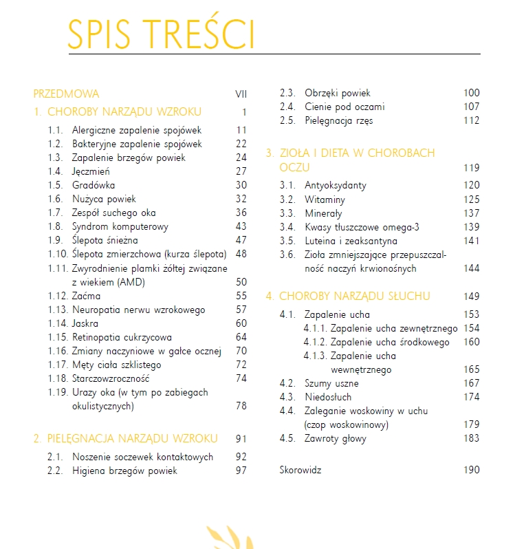 Tym razem autorzy prof. dr hab. Ilony Kaczmarczyk-Żebrowska oraz fitoterapeuta mgr Arkadiusz Ciołkowski wprowadzają czytelników w świat wykorzystania ziołolecznictwa w chorobach narządu wzroku i narządu słuchu.